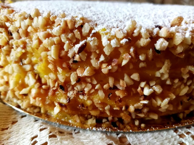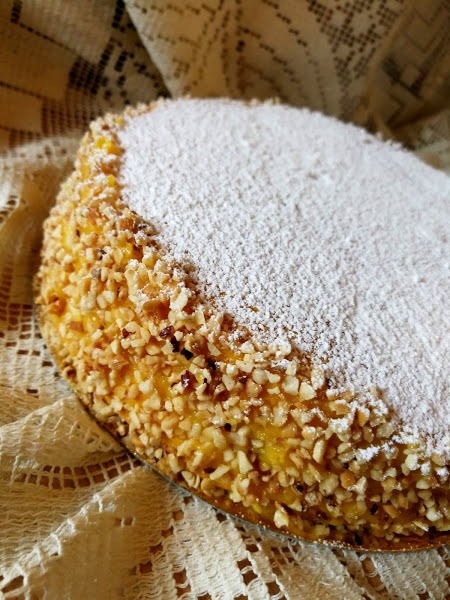 Spalmare la circonferenza con il rimanete lemon curd e far aderire la granella di nocciole.