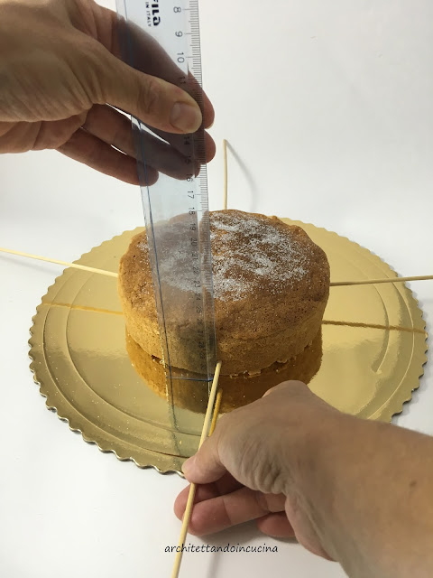 - Con un righello, segnare la misura dello spessore del disco di Pan di Spagna che occorre e posizionare uno spiedino di legno dentro la torta. Posizionarne almeno 4 per piccoli diametri e 8 per diametri grandi.