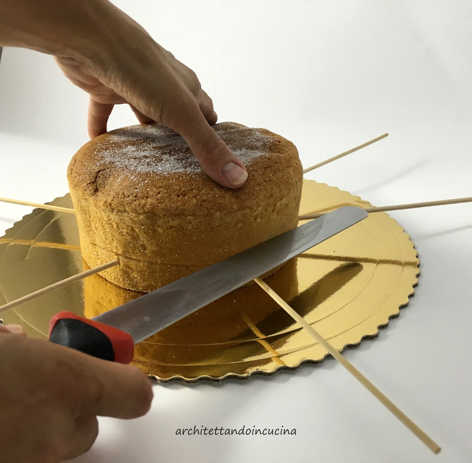 - Appoggiarsi con un coltello da pane a lama seghettata sui bastoncini di legno e girando la torta ritagliare tutto intorno