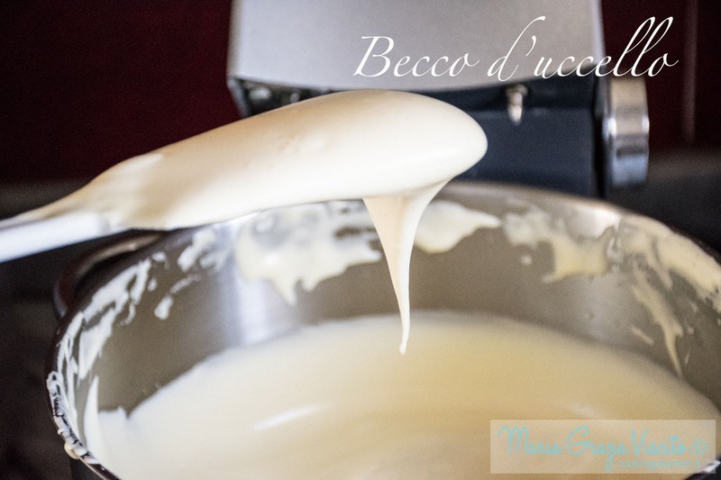 - Montata: la massa è montata quando la frusta lascia solchi visibili in superficie. Per verificare se la montata è pronta si immerge una spatola nella montata, si toglie e se la massa si allunga facendo il cosiddetto “becco d’uccello”, allora è pronta.