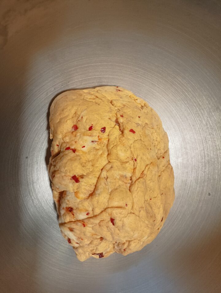 Mettere nel cestello della planetaria le farine, lo zucchero, il lievito di birra ed azionare la macchina. Aggiungere parte del liquido e far incordare, unire l’nduja, lo strutto, il sale e la restante acqua, se necessario.