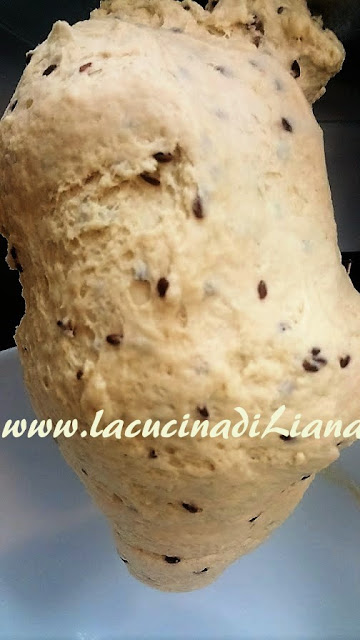 Tritare nel mixer 15 grammi di semi di lino. Sciogliere nella planetaria con la frusta a foglia la pasta madre con il malto e con l’acqua, aggiungere poi lo zucchero e poi dopo avere cambiato la frusta con il gancio aggiungere le farine setacciate, infine aggiungere il sale e l’olio a filo poco per volta per non perdere l’incordatura. Porre l’impasto sul piano di lavoro, coprirlo con la campana di vetro (o con una insalatiera capovolta e lasciarlo per 30 minuti a 25 gradi.