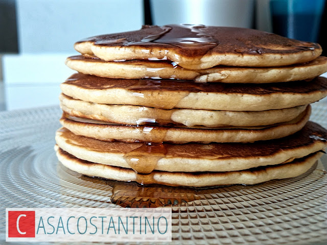 I pancake possono essere portati in tavola impilati e consumati così, un po’ come una torta, o singolarmente. Possiamo irrorarli di sciroppo d’acero, come in foto, o condirli con ciò che preferite. Mio figlio li ha mangiati, ad esempio, con un velo di miele ed uno di marmellata.