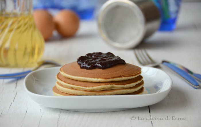 Se c’è una certezza nella mia cucina è che mai preparerò una marmellata. Mi piacciono certo, alcune più di altre, ma non mi cimenterò mai a farle in casa. Diciamo che ho una specie di rifiuto, legato sicuramente al ricordo di quello che accadeva quando ero piccola. Si racconta sempre di dolci ricordi legati all’infanzia e alla nonna, ma la vita reale non è sempre perfetta e ovviamente anche i ricordi non sono tutti tutti bellissimi, a volte anche legati alla nonnina più cara ci possono affiorare alla mente ricordi non così tanto piacevoli. La marmellata … torniamo alla nostra storia. Mia nonna aveva quattro figlie, tutte insegnanti, una professione che allora regalava due mesi interi di ferie, per cui d’estate, mentre i mariti rimanevano in città a lavorare le sorelle e i rispettivi pargoli, andavano a passare un mese nella grande casa di montagna dei nonni. La nonna era molto felice di riavere tutte le sue figlie e di cucinare tutte insieme. Momenti bellissimi e grandi golosità, ma ricordo anche due incubi … i grandi lavori, come li chiamava il nonno, la passata di pomodoro in bottiglia e le marmellate! In queste preparazioni in qualche modo ci incastravano tutti anche noi piccoli, se ci penso vedo ancora tutte loro vicino a quei pentoloni (perchè di tutto nonna decideva sempre di farne quantità per un esercito) sembrava un covo di streghe tra i vapori, gli odori, per me eccessivi, ed il caldo, tanto caldo … porte e finestre aperte non bastavano a far entrare l’aria frizzantina del lago … ed io volevo solo correre fuori a giocare !! Tra le tante marmellate, una delle mie preferite è quella di visciole e l’altro giorno una mia amica me ne ha regalato un vasetto fatto in casa dalla sua mamma. L’avrei mangiata a cucchiaiate tanto era buona, ma indiscutibilmente sarebbe stato eccessivo, per cui ho preferito utiizzarla per servire questi sofficissimi pancake, amorevolmente preparati per i miei cari per la colazione della domenica.