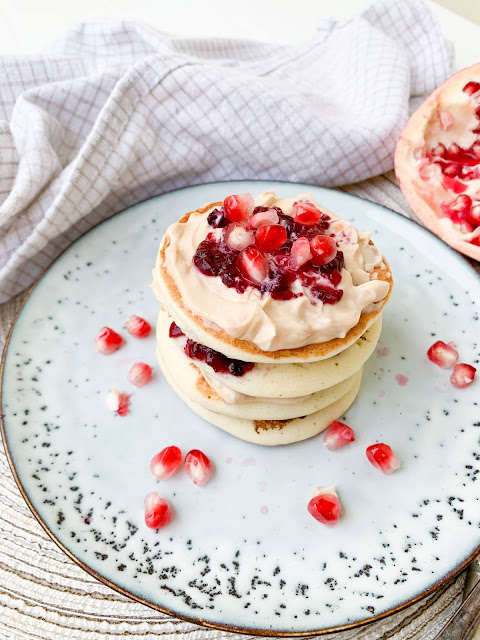 Io li ho farciti con marmellata e una crema proteica preparata amalgamando 2 cucchiaini di yogurt greco con un cucchiaino abbondante di burro di arachidi croccante e un cucchiaino raso di sciroppo d’acero. In ultimo una cascata di chicchi di melograno.
