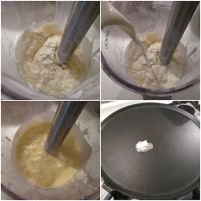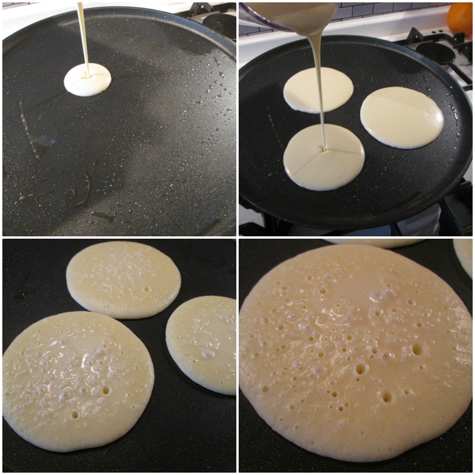 Scaldate una padella antiaderente (meglio se larga e piatta – io uso il testo per le piadine romagnole!) e lasciate fondere sopra un fiocchetto di burro (eliminate eventualmente il burro in eccesso con la carta da cucina). Quando la padella sarà ben calda, versateci un mestolino di pastella (io metto contemporaneamente 3-4 mestolini in maniera da cuocere più frittelle alla volta).