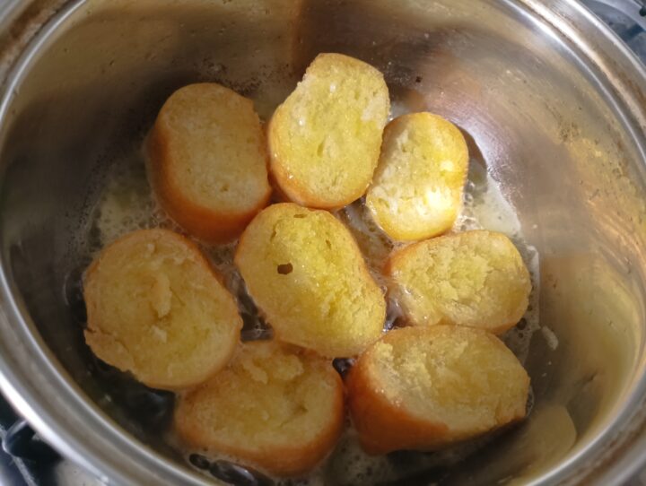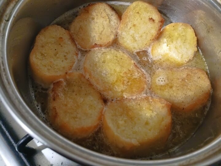 Tagliare il pane raffermo a fette e metterle a rosolare nel burro fuso.