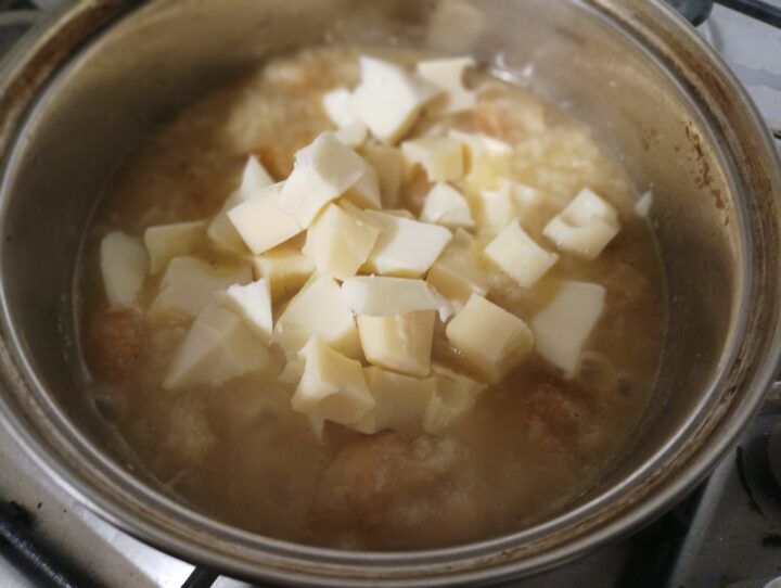 Tagliare i formaggi a cubetti e unirli alla zuppa di pane.