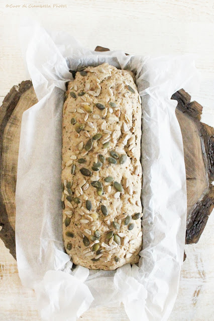 Trascorso il tempo necessario stendi l’impasto con le mani su di un piano (o un foglio di carta forno) leggermente infarinato fino ad ottenere un rettangolo. Arrotola il pane a partire dal lato più corto del rettangolo. Ripiega le due estremità verso il basso e con le mani cerca di modellare un bel filoncino omogeneo. Metti il filoncino in uno stampo da plumcake ricoperto di carta forno. Spennella il pane con un po’ di acqua e distribuisci qualche seme oleoso sulla superficie.