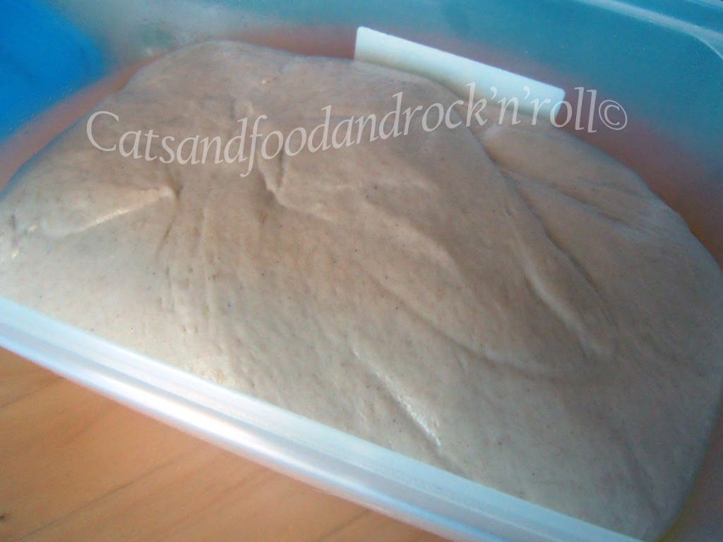 Trasferire l’impasto in un recipiente leggermente unto d’olio, coprire col coperchio e mettere a lievitare per circa 15 ore. Ovviamente, come sempre, il tempo è indicativo. Io avevo 21° di temperatura ambientale e ho tenuto il contenitore avvolto in una copertina. Metto le foto dell’impasto a distanza di 15 e passa ore, per mostrare come si presentava.
