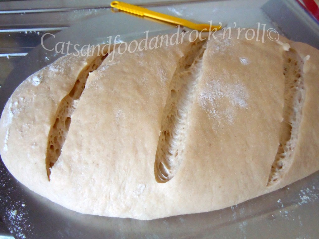 Ribaltare la pagnottella su una pala ben infarinata e praticare dei tagli con una lama ben affilata, quindi far scivolare sulla refrattaria, poggiata sulla griglia posta nella scanalatura più bassa, e far cuocere per 15 minuti a 250°, 10 minuti a 200° e 15 minuti a 180°. Di nuovo, i tempi sono, come sempre, indicativi.