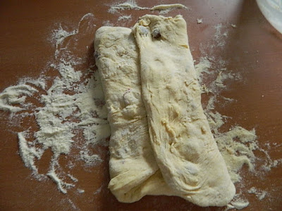 e porlo sul piano di lavoro infarinato con la semola (uso la semola per non far prendere troppa farina all’impasto) stendere l’impasto