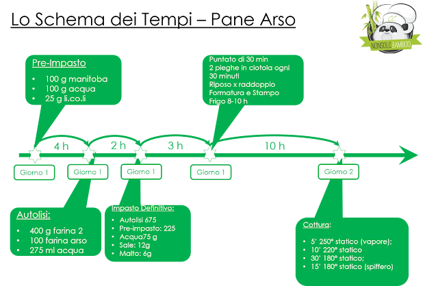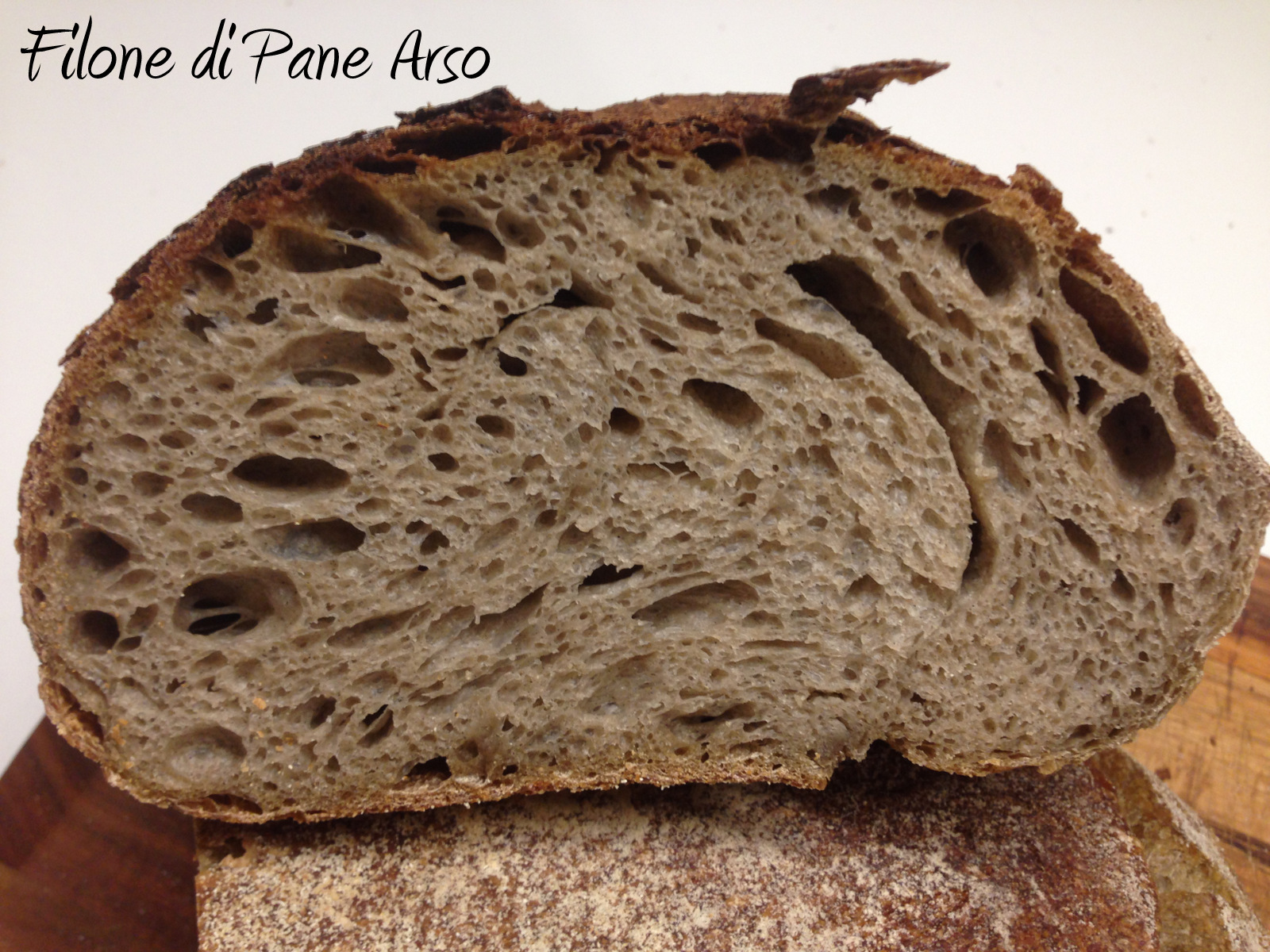Da quando la panificazione ha preso piede, negli ultimi anni, l’attenzione verso le farine, in termini di caratteristiche e sapori, è cresciuta in modo esponenziale. Parlare di W, rapporto P/L, % proteine è come parlare del GF nei primi anni del 2000. Chi poi, come me, è appassionato, cerca sempre di provarle tutte o quasi, chiedendo consigli a chi le ha già usate su impiego, % idratazione, “taglio”, etc. Oggi parliamo della farina “arsa”. Un pane che affonda le radici nella terra che ha regalato i natali a quella “santa” donna di mia moglie che, bontà sua, comincia ad apprezzare i pani domestici. Secondo la tradizione, in passato, i contadini del tacco italico, dopo la lavorazione del grano, potevano tenere per sè i chicchi bruciati, da cui ricavavano – attraverso una successiva macinazione – della farina. E’ una farina debole di suo, che, per via del trattamento subito, perdeva ancor di più le proprie caratteristiche organolettiche, quindi il mio consiglio è di non superare il 20% del totale. Da par suò, però, regala una nota aromatica affumicata spettacolare. Ideale per le bruschette. Io l’ho utiizzata come supporto alla farina di tipo 2 e devo dire che il risultato è stato notevole…eccolo
