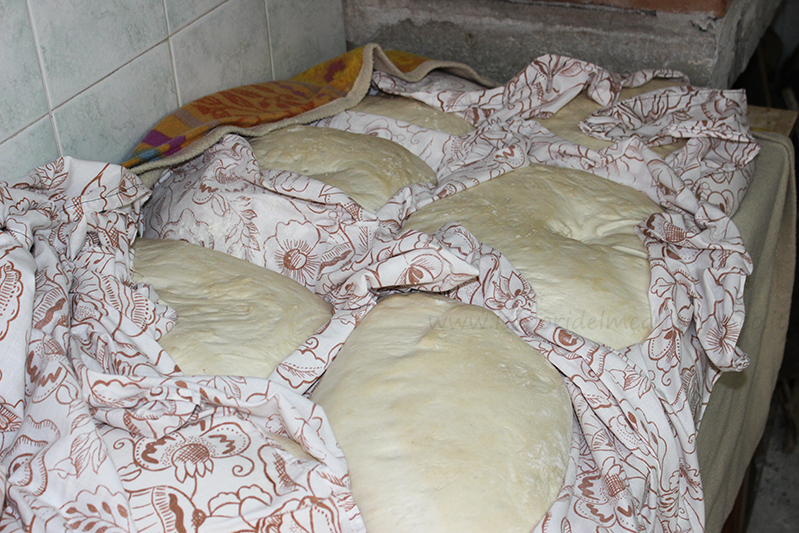 Dopo un ora si rimpastava un 5 minuti e si formavano i panetti di circa 2 kg l’uno, che venivano messi a lievitare nelle grosse tovaglie poggiate su delle tavole di legno.