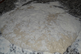 Unire gli ingredienti del secondo impasto e lavorare energicamente con le mani, fino ad ottenere un impasto liscio ed omogeneo (piuttosto morbido, quasi colloso): versare farina abbondante sulla spianatoia e versarvelo sopra, stendendolo con le mani infarinate fino allo spessore di circa 1,5 cm, infarinandolo molto bene anche sopra.