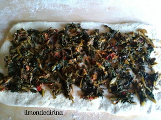 Adesso prendete l’impasto, versatelo sulla spianatoia infarinata e con le mani unte d’olio appiattitelo, fino a formare un rettangolo. Versate sopra la cicoria, arrotolatelo e ponetelo su una teglia ricoperta con carta forno.