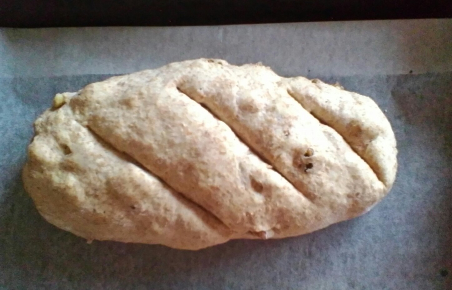 Infine trasferite il filone sulla leccarda ricoperta con carta forno e fate sulla superficie dei tagli trasversali.