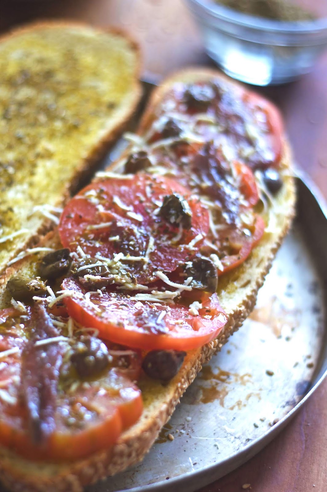 Adagiare le fette di pomodoro, i filetti d’acciuga, le olive e il formaggio grattugiato grossolanamente.