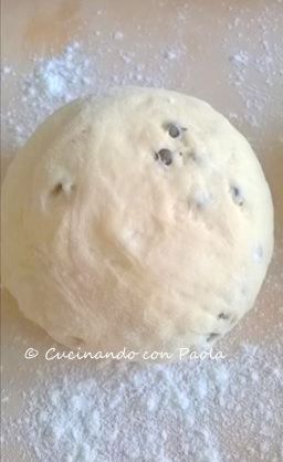 Versare 200 ml di acqua tiepida in una terrina. Versare la confezione di preparato e lasciare riposare così come sono per 5 minuti. Impastare energicamente a mano per 10 minuti. Versare l’impasto sul piano di lavoro infarinato e allargatelo, cospargete le gocce di cioccolato e ripiegate a modo di fazzoletto. Impastate velocemente per 5 minuti e lasciatelo lievitare per 120-180 minuti.