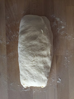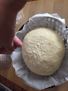 Quando l’impasto è lievitato cospargerlo con farina di semola e delicatamente coprire di farina tutta la superficie.