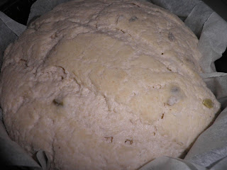 Mettete a lievitare in un cestino rivestito con un canovaccio. Coprite e aspettate che raddoppi. Il mio ci ha messo 7 ore. Infornate a 200° mettendo nel forno un pentolino di acqua bollente. Fate cuocere per 45 minuti circa.
