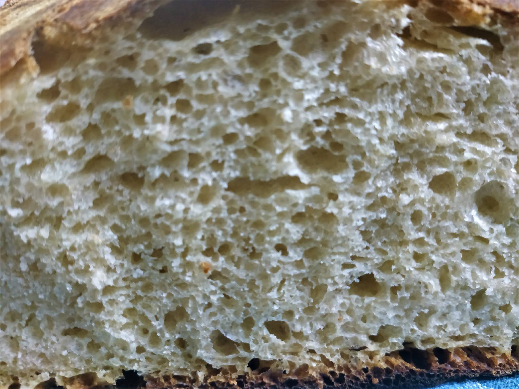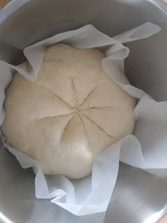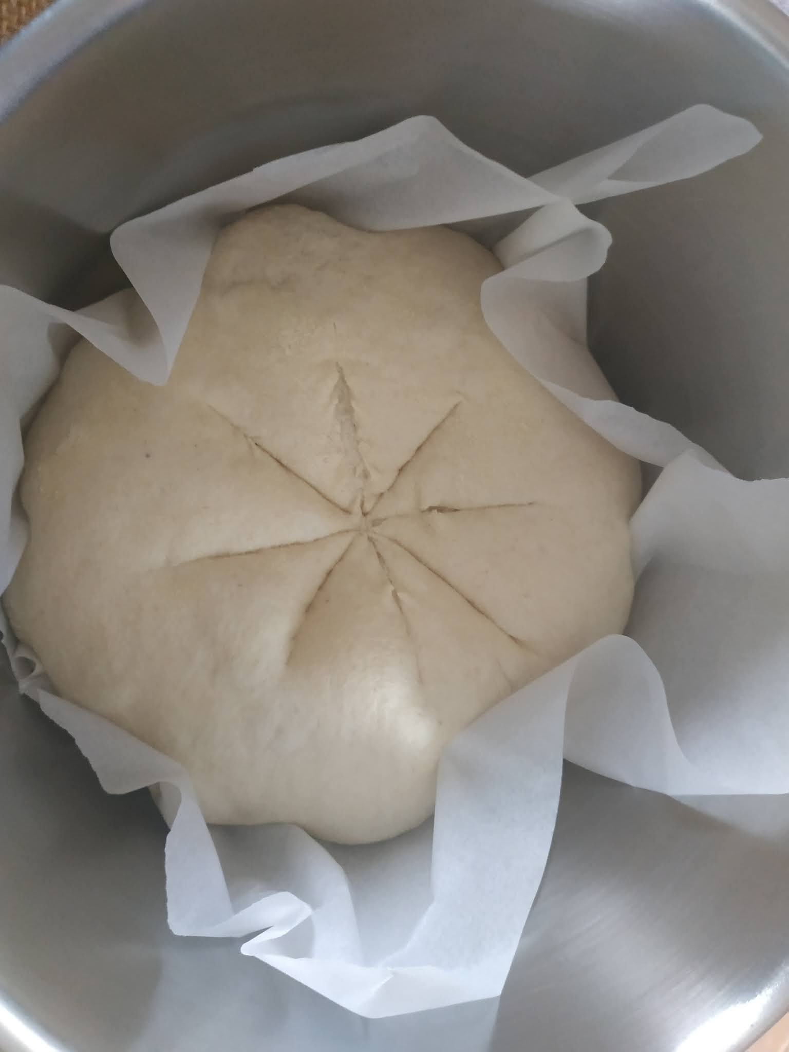 Ho utilizzato una farina di grano tumminia, un grano antico siciliano e il mio solito impasto: 300 g di pasta madre, 300 g di semola di grano duro e 300 g di farina di tumminia, 20 g di sale, idratazione al 60%, quindi 360 g di acqua. Ho impastato il tutto e ho formato una grossa palla che ho posizionato dentro una ciotola con un foglio di carta da forno sotto.