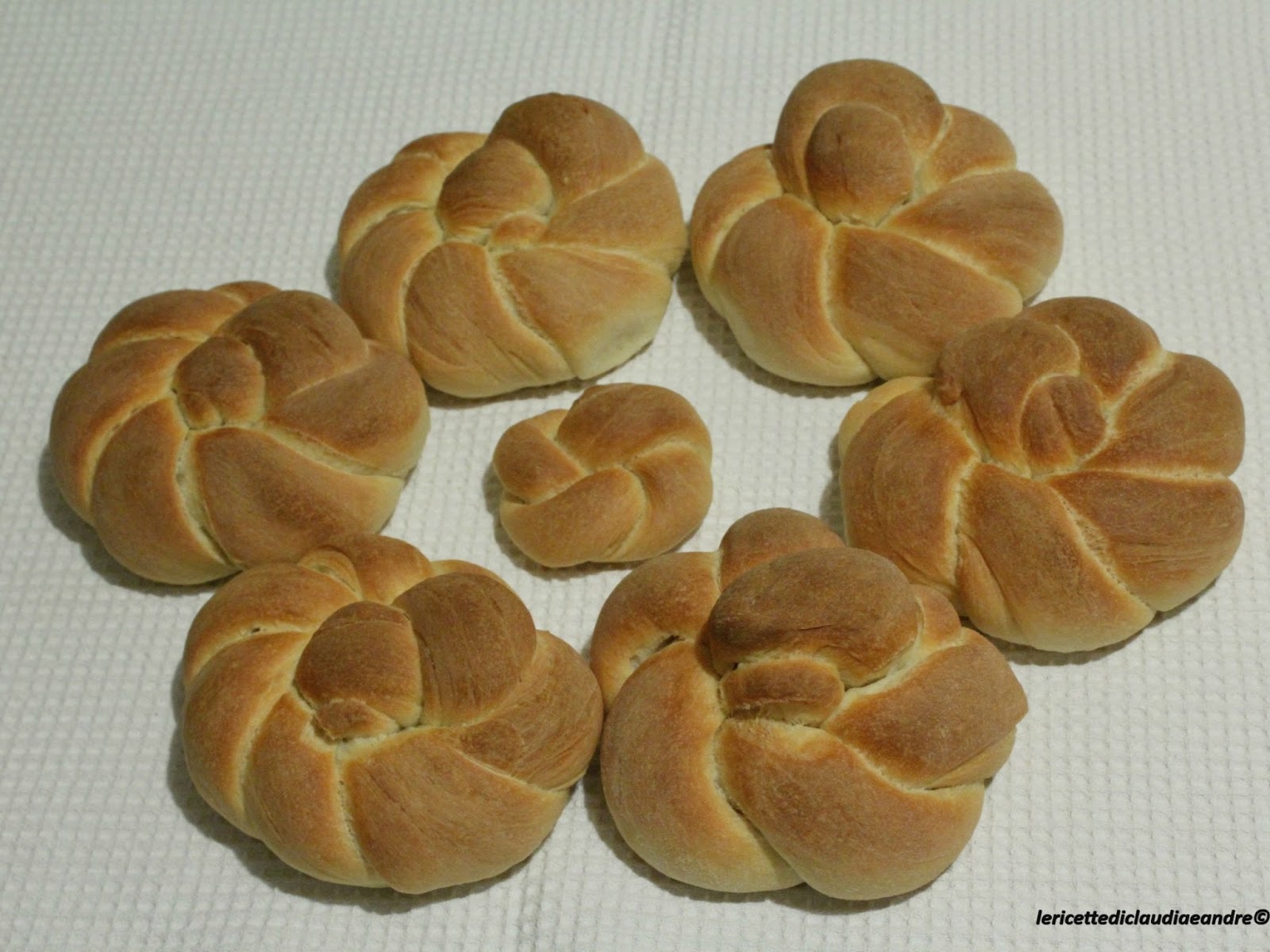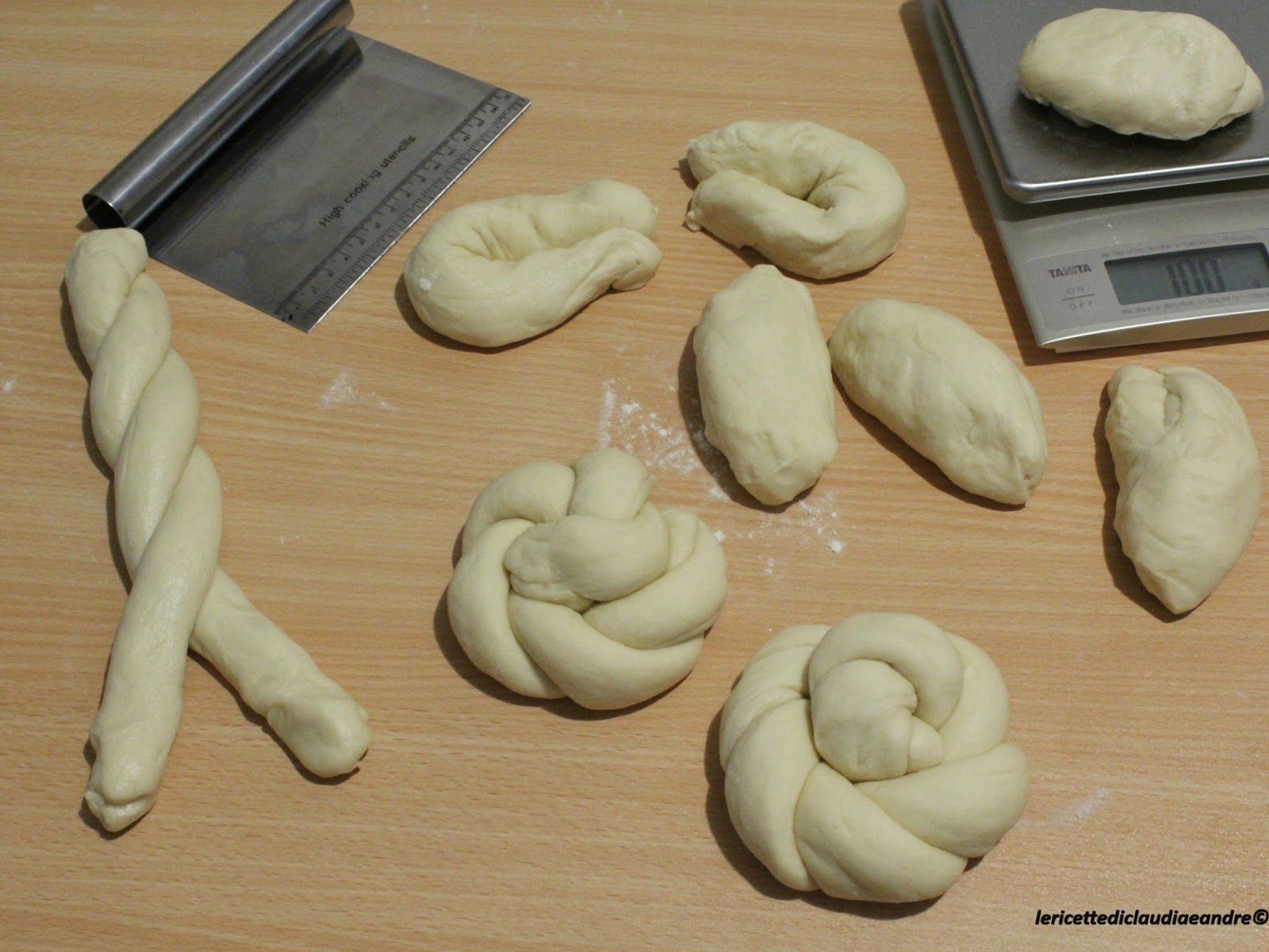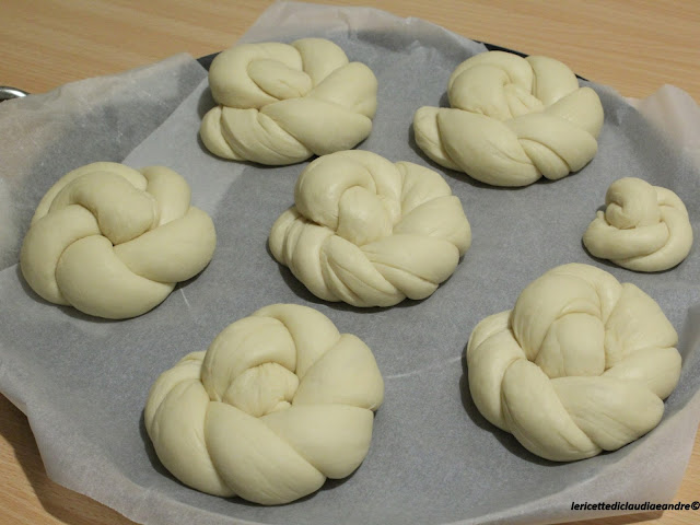 - A questo punto dividere l’impasto in pezzi da 100 g ciascuno, formare dei filoncini e attorcigliare due a due arrotolandoli nel modo da dare la forma alla pagnotta.(E’ rimasta anche un pezzo più piccolo da 45 g e ho fatto una più piccola )