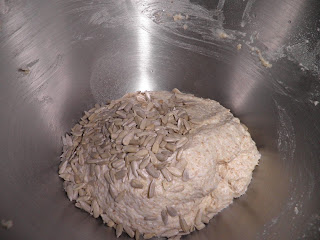 Ingredienti: 200 g di lievito madre (oppure 5 g di lievito di birra), un cucchiaino di miele, un cucchiaino di malto, 200 g di farina integrale di grano tenero, 200 g di semola integrale di grano duro (varietà Russello) macinato a pietra, sale, 50 g di semi di girasole, 170 g circa di acqua Sciogliete il lievito con l’acqua, il miele e il malto. aggiungete le farine e impastate molto bene.
