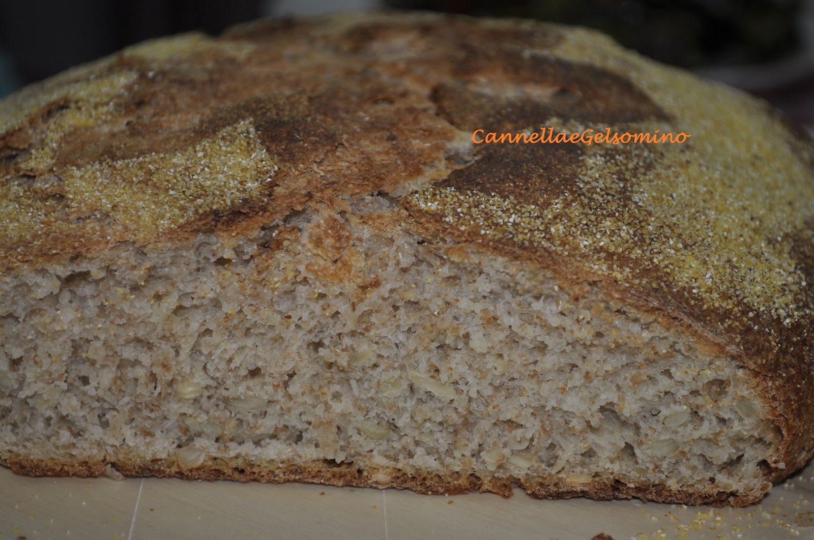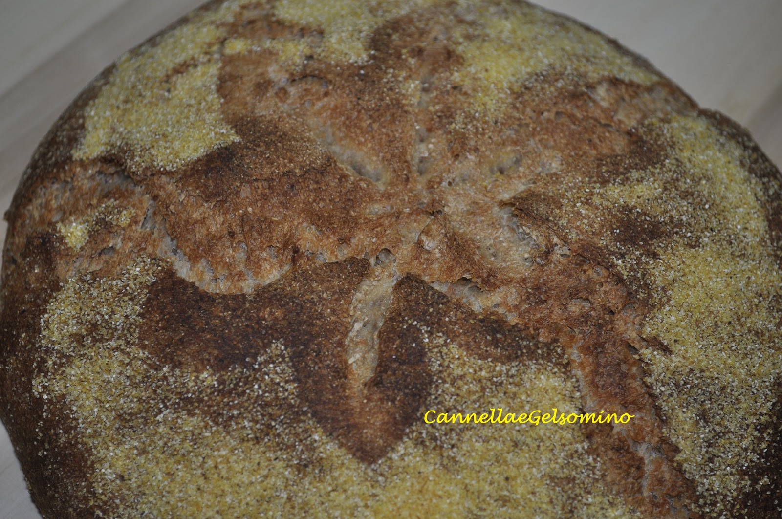 Formate una palla e mettete a lievitare in un cesto di vimini coperto da un canovaccio. Nella parte inferiore metto della farina gialla che aderirà al panetto. Far lievitare per 5/6 ore. Mettere il pane sulla placca da forno e incidere con il coltello una forma di stella. Infornare a 200° per 45 minuti.