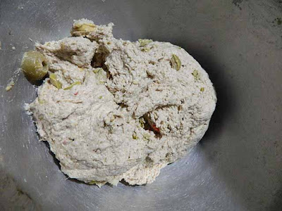 per ottenere un alimento di primaria importanza, il pane, reso più ricco con l’aggiunta di olive, in questo caso ho scelto olive verdi denocciolate condite con peperoni gialli e rossi.