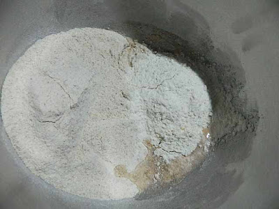 Nella ciotola della planetaria o se volete sulla spianatoia, mettere il lievito sciolto nell’acqua appena tiepida e le farine,