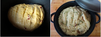 Riponiamolo al centro della nostra cocotte Crafond da 24 cm leggermente spennellata d’olio e.v.o., ungiamone la superficie con l’olio dei pomodori secchi quindi copriamolo col coperchio e rimettiamo a lievitare per altre 2 ore. Trascorso il tempo di lievitazione, il nostro impasto dovrebbe essere nuovamente raddoppiato di volume. Cospargiamone la superficie con un po’ di rosmarino quindi spostiamo la cocotte sulla fiamma, a fuoco medio, per 40′ circa. Controlliamo la cottura scoperchiando la cocotte, il risultato dovrebbe essere un pane croccante, profumato e fragrante.