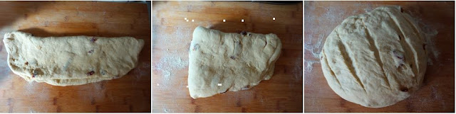 Ripieghiamo il nostro impasto in due e poi in quattro quindi cerchiamo nuovamente di dargli una forma tonda ed incidiamone, con l’aiuti di un coltello ben affilato, la superficie.
