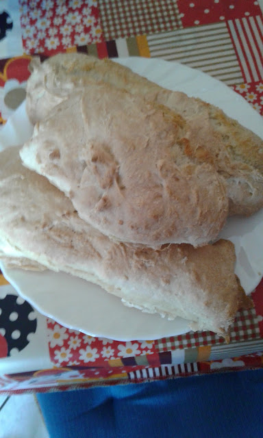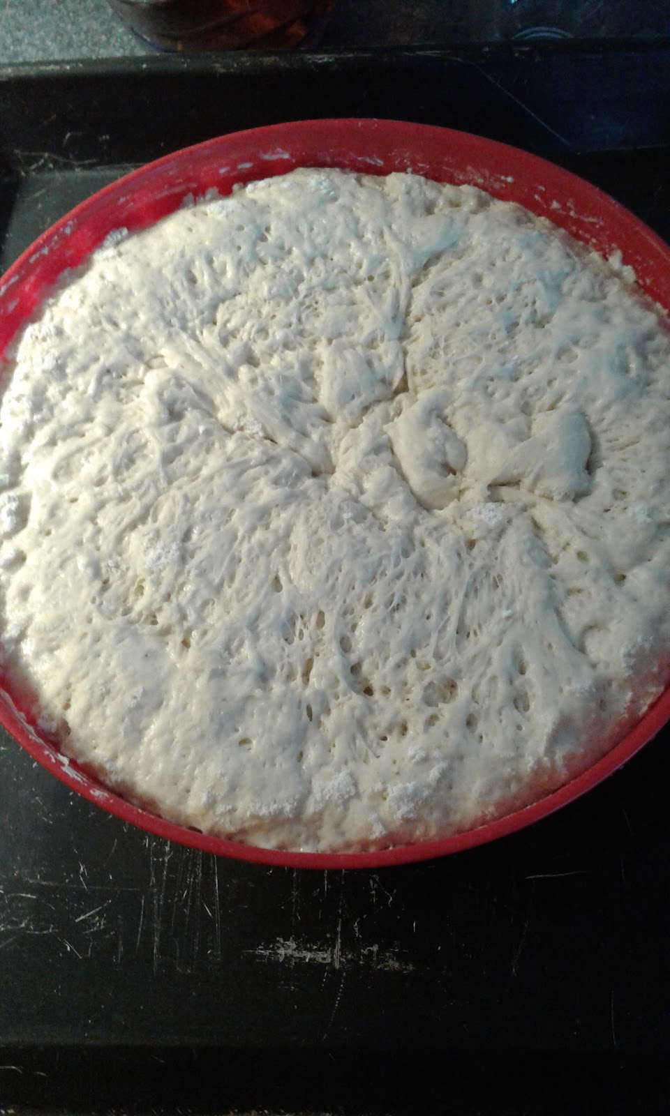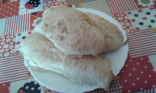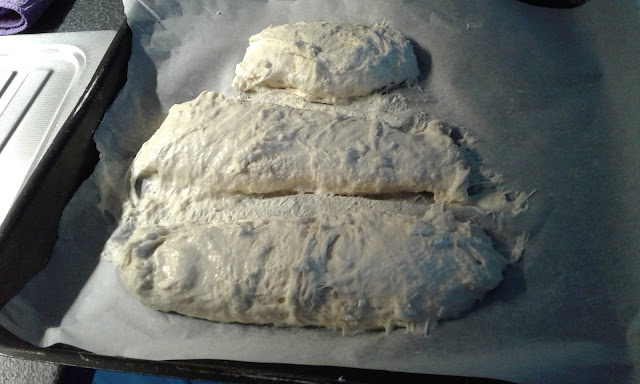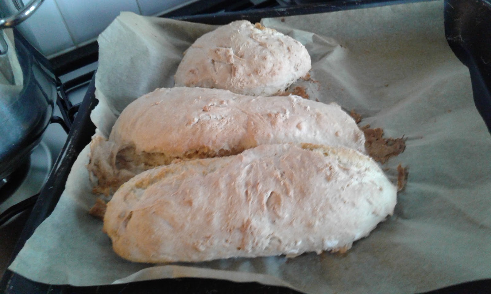 Spolverate con un po’ di farina, coprite e fate lievitare per un’ora e mezza. Infine fate scendere l’impasto sulla teglia rettangolare infarinata o foderata con carta da forno e separate l’impasto in tre pagnotte con un coltellino. Spolverate ancora con un po’ di farina e fate cuocere a 230 gradi per 30 minuti circa, forse anche meno.