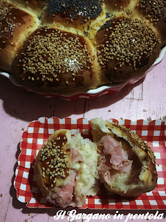 Stendiamole una alla volta con il mattarello ( o con le mani) e farciamole con il prosciutto cotto e la scamorza. Richiudiamole a palla e disponiamole in una teglia rotonda (con la parte della chiusura verso il fondo). Lasciamo lievitare ancora 1 ora.