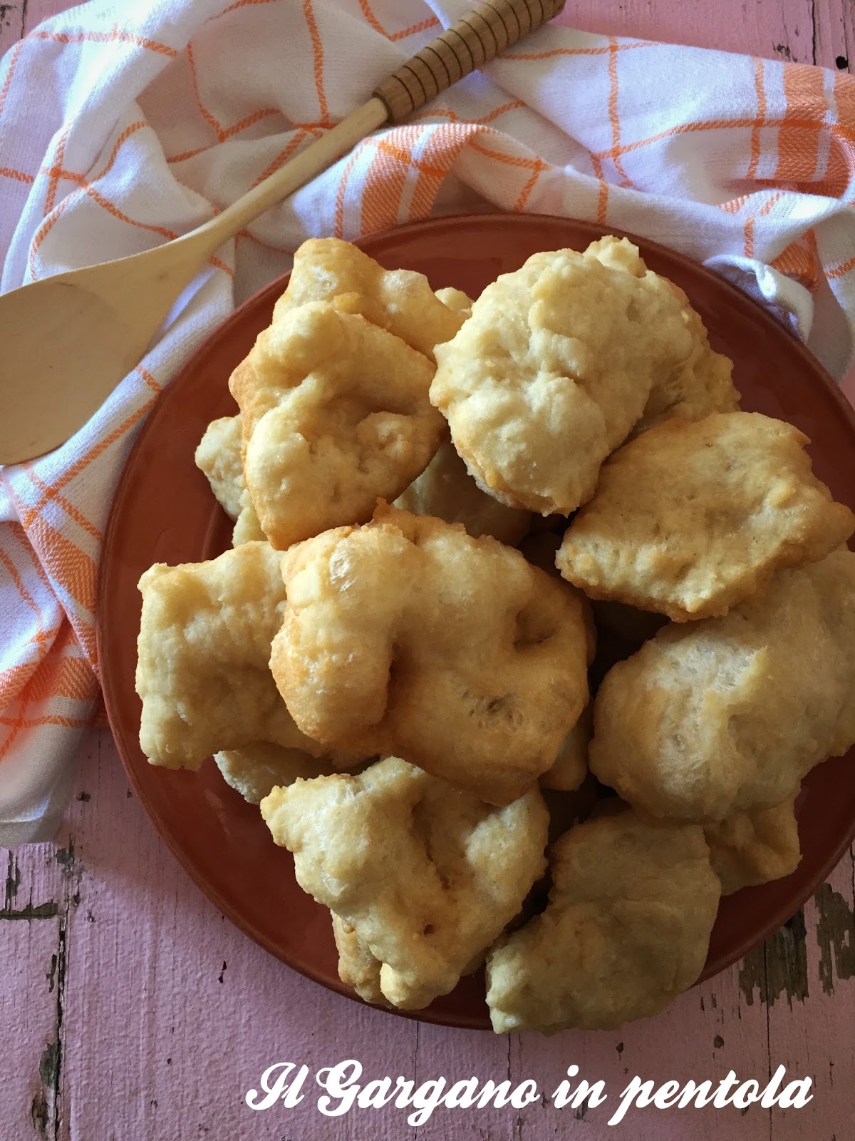 Trascorso il tempo necessario ungiamoci leggermente le mani con un pò di olio e stacchiamo dei pezzettini di pasta, stendiamoli il più possibile tirando e allargando, e tuffiamoli nell’olio ben caldo.