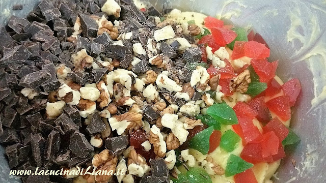 Se l’impasto sarà ben incordato e farà il velo, aggiungere i canditi, il cioccolato e le noci.