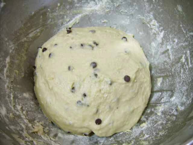 lavorare l’impasto fino a quando non si incorda bene al gancio e sara’ un impasto molto morbido e un pò appicicoso a questo punto aggiungere le gocce di cioccolata fondente e lavore l’impasto per distribuirle uniformemente