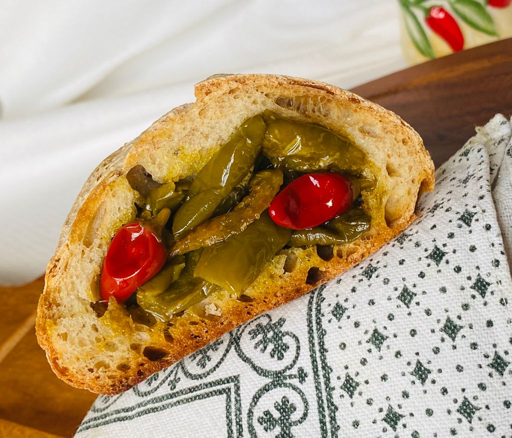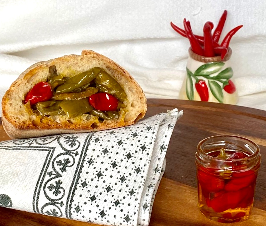 Versate abbondante olio evo in una padella e fatevi rosolare lo spicchio d’aglio. Aggiungete i peperoncini e i filetti delle sarde che farete sciogliere. In un’altra padella soffriggete gli ortaggi e appena sfrigolano versateli nel condimento piccante e fateli insaporire per pochi minuti. Trasferite poi l’intingolo dentro il fondo del pane svuotato, ‘u sgangu e copritelo con la calottina di mollica. Il pane cu ‘u salaturi va consumato sia tiepido che freddo, dopo averlo fatto riposare in modo che il condimento lo ammorbidisca.