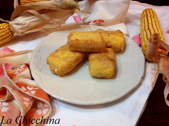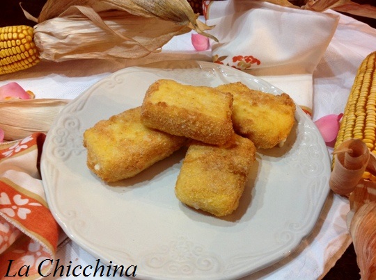 Da tempo pensavo alla possibilità di friggerla a fette, impanata e farcita; allora oggi mi sono messa all’opera… Il risultato? Una delizia che permette di riutilizzare sia la polenta avanzata, che gli avanzi di formaggio (o quello che più piace).