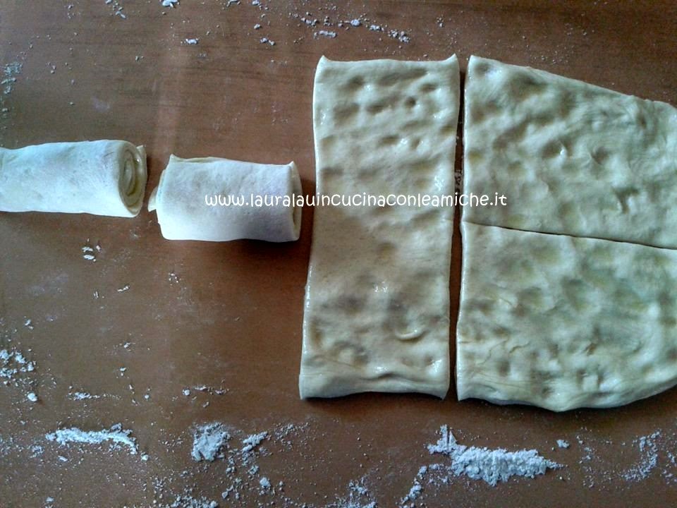 Arrotola i rettangoli dalla parte del lato corto tirando leggermente verso l’esterno l’impasto nei primi 2 giri,