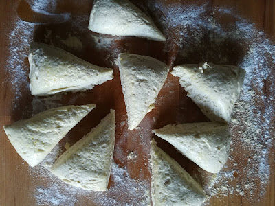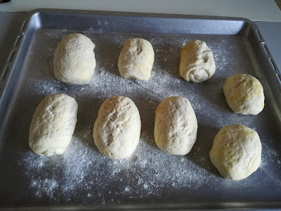 A questo punto ho utilizzato il metodo dei Panini veloci di Bimba Pimpa per cui , senza lavorare né sgonfiare l’impasto ho tagliato la palla in 8 spicchi usando una spatola tagliente. Prendere quindi ogni spicchio e allungarlo delicatamente con le mani (senza sgonfiarlo). Partire dalla punta e arrotolarlo su se stesso.