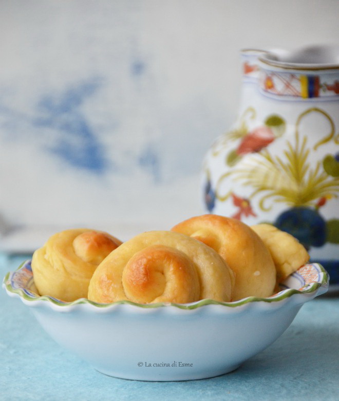 Iniziate preparando il lievitino, in una ciotola mescolate con una forchetta tutti gli ingredienti previsti, coprite con della pellicola e lasciate lievitare per circa 1 ora. Trascorso questo tempo, nella ciotola della planetaria inserite il lievitino, metà delle farine e parte della crema, avviate la macchina e non appena si sarà formato l’impasto, inserite poco per volta il resto degli ingredienti: il latte in polvere, il resto delle farine, l’albume, l’olio e il resto della crema, seguitate a lavorare. Aggiungete il latte a filo senza spegnere la planetaria ed in ultimo il sale. A questo punto passate a velocità sostenuta e lasciate incordare l’impasto per circa 15 minuti. Coprite la ciotola della planetaria con della pellicola e lasciate lievitare fino al raddoppio, circa 2 ore. Passate alla fase della formatura. Fate delle piccole pezzature, da 30/40 grammi l’una e date ad ognuna una forma a spirale, o anche semplicemente una classica forma sferica. Man mano che le formate posizionate le vostre spirali, distanziate, su teglie ricoperte di carta forno. Fate lievitare nuovamente fino al raddoppio, semplicemente coperte con un panno. Spennellate con il latte ed infornate a 180° per circa 20 minuti.