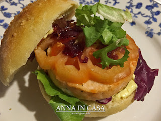 Io ho servito i panini spalmati con la maionese senza uova, burger di salmone, fette di pomodoro, composta di cipolle e insalata fresca.