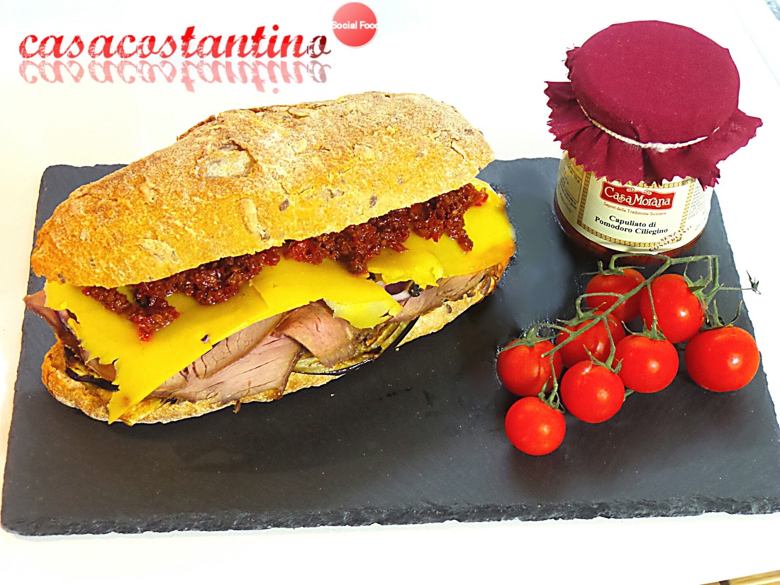 In questo panino ho voluto unire ingredienti freschissimi, di qualità elevata e riconosciuti universalmente come eccellenze. La cipolla rossa di Tropea non ha bisogno di presentazioni, Un formaggio d.o.p. delle Madonie dal profumo e dal sapore eccezionali grazie anche allo zafferano. Il capuliato di pomodoro ciliegino Casa Morana, ottenuto semplicemente macinando il pomodoro secco, senza l’aggiunta di additivi e conservanti, e conservandolo sottolio; una ricetta tipica della tradizione siciliana, fatta con ingredienti semplici: pomodoro ciliegino secco ed olio di semi di girasole. Il prodotto, anche se trasformato, mantiene tutta la dolcezza del pomodoro appena raccolto. Provatelo e fatemi sapere se vi è piaciuto.