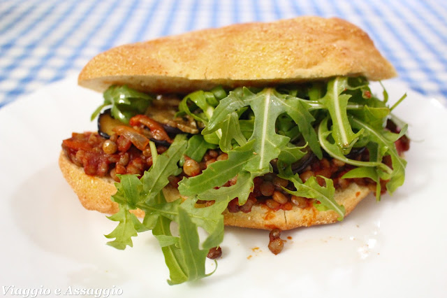 Cook lentils according to package directions. In a pan, cook (without oil) sliced eggplant, then arrange them on a bowl and season with chili, salt, garlic, oil and vinegar. In a second pan, fry sliced onion, then add finely chopped carrot and after few minutes add tomato sauce. Salt. Add cooked lentils and stuff sandwiches with lentil ragout. Put the sandwich in preheated oven to warm for a few minutes and complete it with eggplant and rocket salad. Serve immediately.