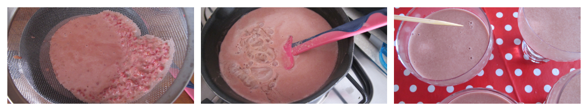 Filtrate la panna con un colino, così eliminerete i semini dei lamponi e il dessert sarà più piacevole da gustare. Strizzate la gelatina e aggiungetela alla panna che avrete rimesso sul fuoco; mescolate con la fiamma al intimo finché la gelatina sarà completamente sciolta. Trasferite subito la crema nelle coppette, io ho utilizzato uno stuzzicadenti per scoppiare le bollicine d’aria formatesi in superficie, è un passaggio che ha una funzione puramente estetica, non è fondamentale.