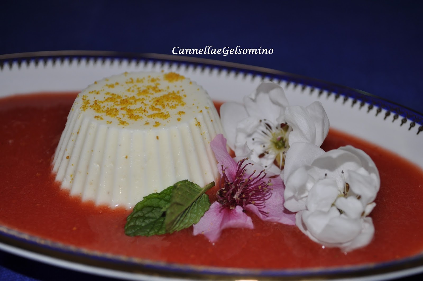 Alla base del piatto mettete il coulis di fragole, adagiate sopra la panna cotta, completate con della polvere d’arancio e decorate con qualche fiorellino.