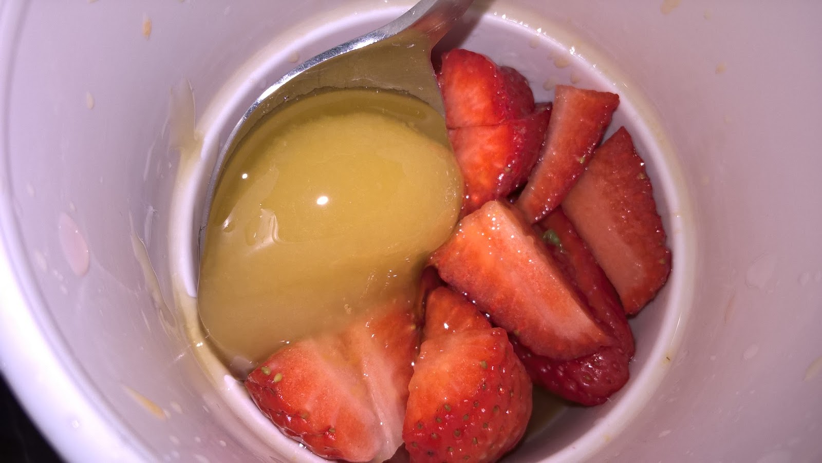 Intanto mettete 300 g di fragole a pezzi in un contenitore, addolcite con il vostro miele preferito (io ho scelto quello d’arancio) e frullate con un mixer ad immersione.