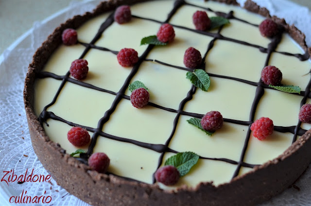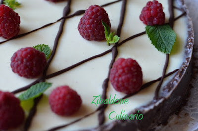 Prima di servire, togliere il dolce dal frigorifero, posizionarlo sul piatto di portata, fondere il cioccolato e metterlo in un cono di carta forno, decorare la superficie con il cioccolato fuso, i lamponi e foglioline di menta.